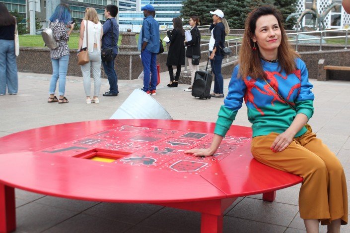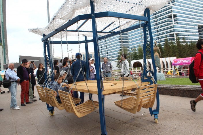 На территории фестиваля можно покататься на качелях, а можно кататься на качелях, сидя за столом - такое необычное произведение искусства создали казахстанские дизайнеры.