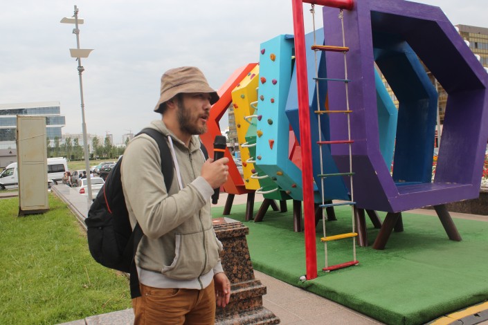 "Это наше предложение городу, в своих проектах я попытался соединить функцию и эстетику. Так как тематика нашего фестиваля неономадизм, эта детская площадка представляет собой сказочного персонажа, который бродит по свету, собирает на себе разные артефакты, истории, которые дети могут рассказывать друг другу", - поделился замыслом Ерлан Хамитжанов.