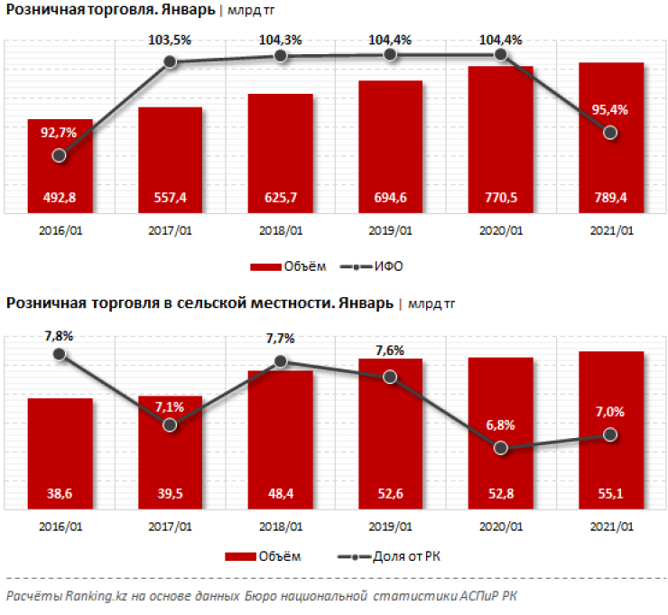 На сельскую местность, по официальным данным, приходится лишь семь процентов розничных продаж: за январь - 55,1 миллиарда тенге. Ситуация мало изменилась с января 2020 года, когда официально проведенный по чекам объем ретейла в селах составлял 52,8 миллиарда тенге, или 6,8 процента от всей розничной торговли по Казахстану.