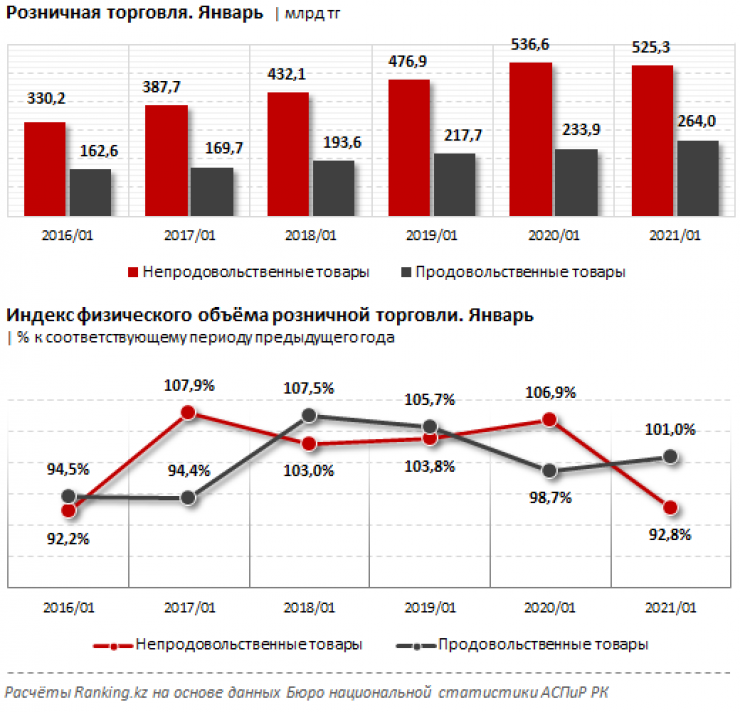 Две трети объема розничной торговли в январе 2021 года приходились на непродовольственные товары: 525,3 миллиарда тенге, при реальном спаде с учетом инфляции на 7,2 процента за год.