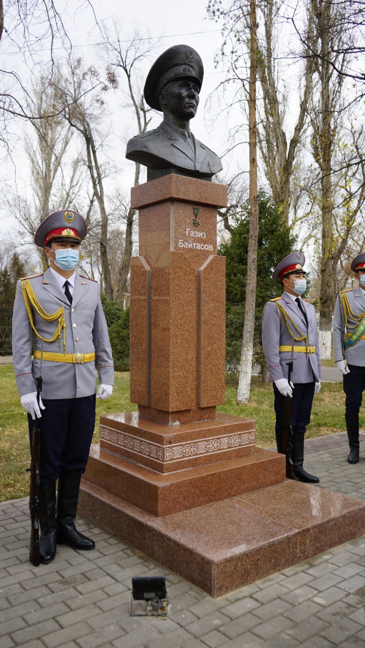 Сегодня в Таразе прошла церемония возложения цветов к бюсту Газиза Байтасова. Потом память героя почтили минутой молчания и церемониальным салютом из трех залпов.