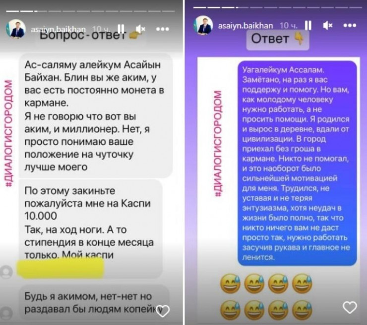 "Блин, вы же аким, у вас есть постоянно монета в кармане. Я не говорю, что вот вы - аким и миллионер. Нет, я просто понимаю, ваше положение на чуточку лучше моего. Поэтому закиньте, пожалуйста, мне на Каспи 10 000. Так, на ход ноги. А то стипендия в конце месяца только", - написал молодой человек акиму, указав номер, куда скинуть помощь.