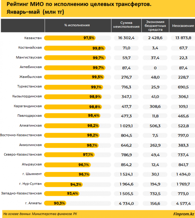 Сумма неисполнения составила 16,3 миллиарда тенге, причем из них всего 2,4 миллиарда тенге составила экономия средств, а сразу 13,9 миллиарда тенге - неосвоенная сумма. Фактически в период непростой экономической и социальной обстановки в стране местные исполнительные органы (МИО) не освоили почти 14 миллиардов тенге, которые предназначались для определенных целей, призванных улучшить жизнь населения, отмечают аналитики Finprom.