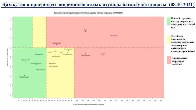 - в "желтой" зоне - Шымкент, Алматинская, Актюбинская, Костанайская, Карагандинская, Западно-Казахстанская, Восточно-Казахстанская области;
