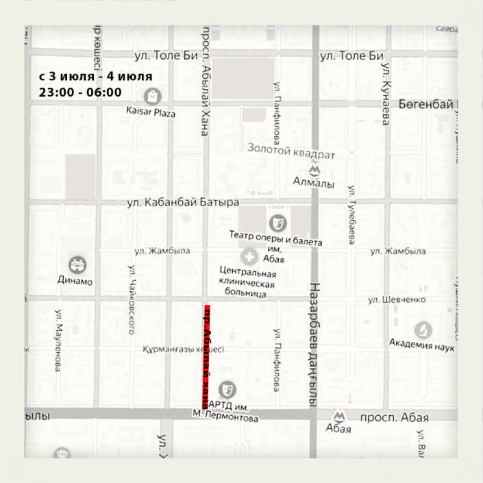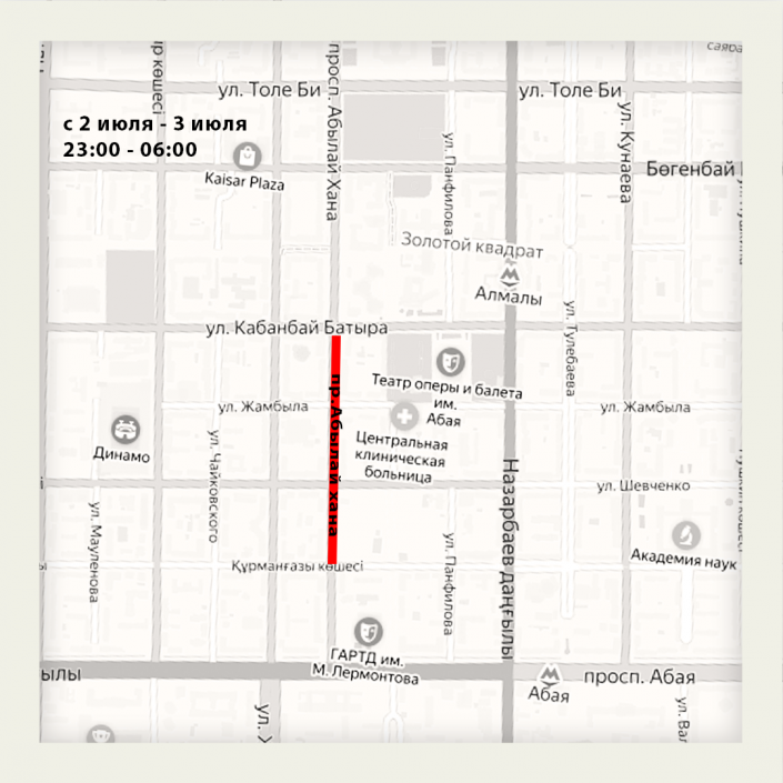 4 июля ночью проезд автотранспорту по Абылай хана перекроют от улицы Шевченко до Кабанбай батыра.