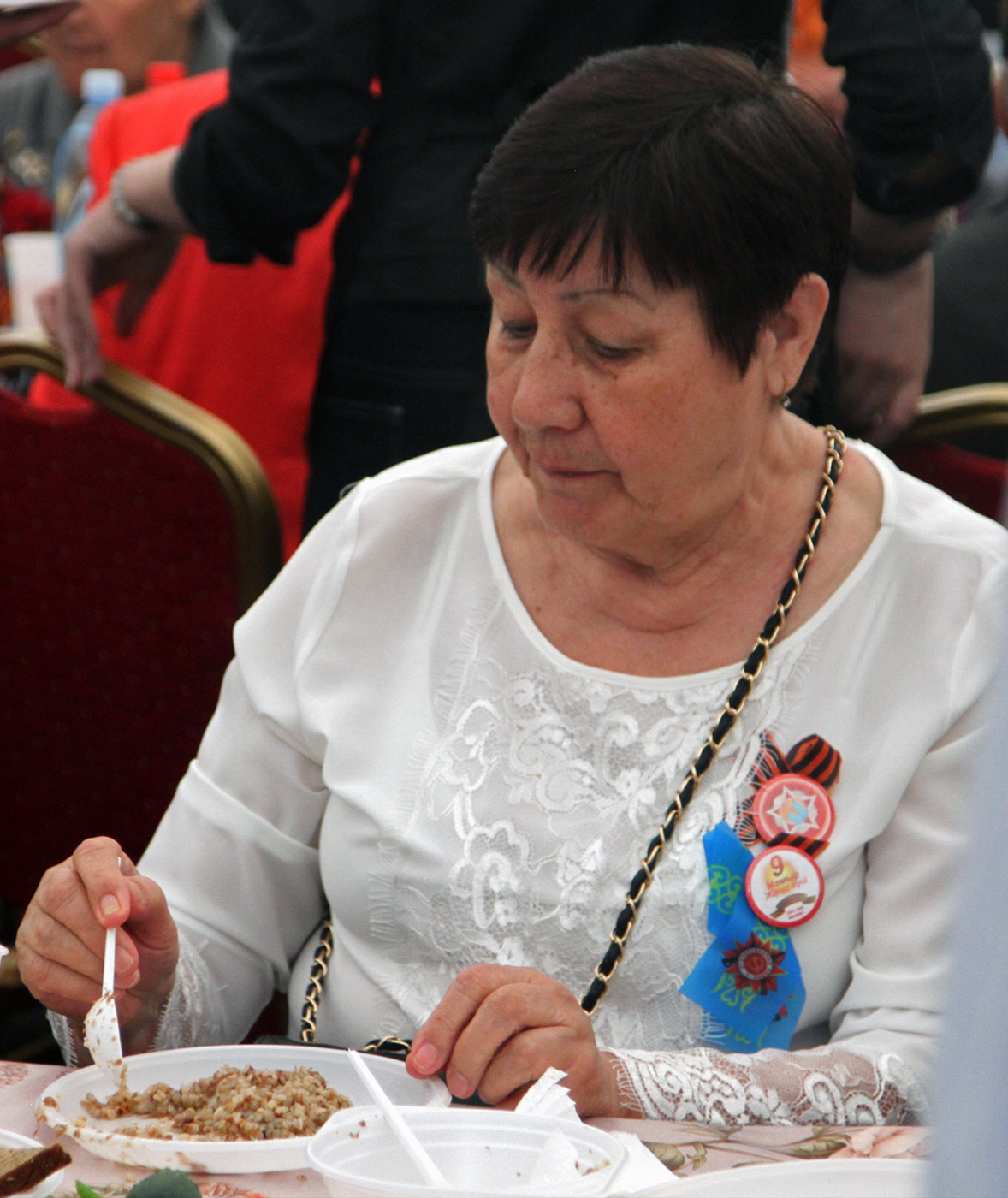 После речи градоначальника прозвучал гимн Казахстана. Затем состоялось возложение цветов. Всего в парк сегодня пришли более 5000 человек, чтобы послушать и спеть песни военных лет. Собравшиеся поздравляли ветеранов и кричали "Спасибо!". В парке организовали праздничный обед для ветеранов и концерт. Полевую кухню развернули возле Свято-Вознесенского собора. Также сегодня, 9 мая, на площади Астана в 20.00 начнется праздничный концерт. А залпы юбилейного салюта будут даны в 22.00 одновременно с двух точек мегаполиса - площади Астана и озера Сайран.