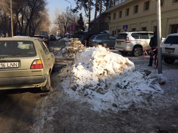 В частности, пользователь Facebook Вера Ляховская сфотографировала неубранный сугроб, лежащий прямо на проезжей части, в районе пересечения улиц Шевченко и Байтурсынова.