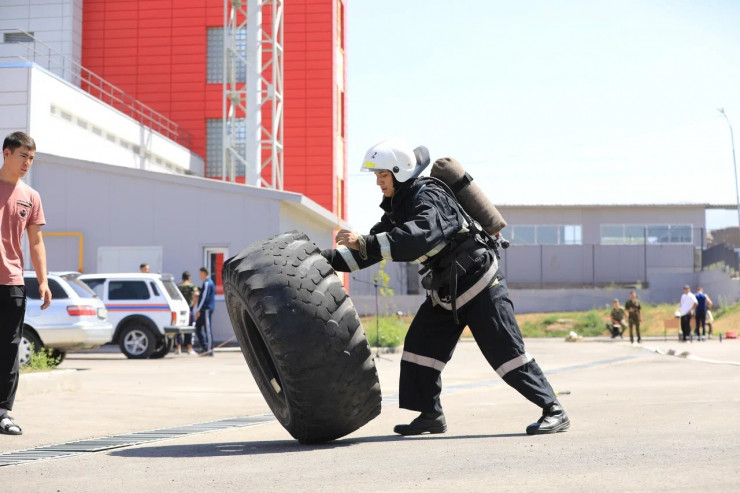 Слушатель учебного центра по Алматы Академии гражданской защиты имени М. Габдуллина МЧСРК выполнил элементы силового кроссфит-упражнения, переворачивая на скорость автомобильную покрышку от автомашины "Урал" весом до 100 килограммов.