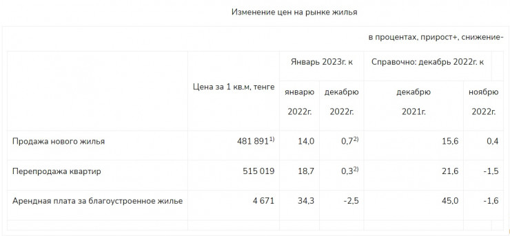 По данным бюро, цена за квадратный метр нового жилья составила 481 891 тенге, при перепродаже жилья на вторичном рынке - 515 019 тенге, арендная плата за благоустроенное жилье составила 4671 тенге за квадратный метр.