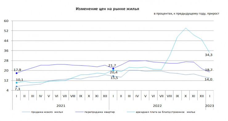 "За месяц (январь 2023 года к декабрю 2022 года) цены на продажу нового жилья повысились на 0,7 процента, на перепродажу квартир - на 0,3 процента. Продолжается тенденция снижения арендной платы, в январе по сравнению с предыдущим месяцем средняя стоимость снизилась на 2,5 процента", - говорится в сообщении.