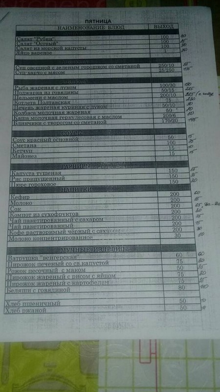 На снимках представлено меню с понедельника по пятницу. Так, стоимость первых блюд начинается от 50 тенге за порцию и не превышает 135 тенге (самое дорогое), а вторых (без гарнира) не превышает 265 тенге (самое дорогое). Цена салатов - от 30 до 190 тенге.