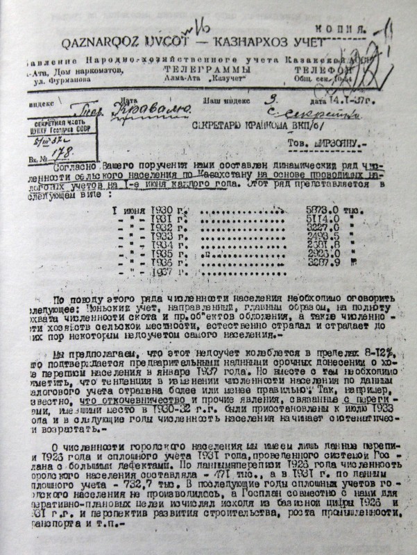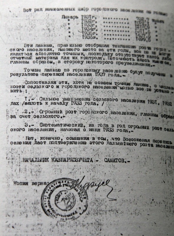 "Мен бұл архивке Елбасы Нұрсұлтан Назарбаевтың атынан барып қана кіре алдым. Мен онда барып, 37-жылғы санақ материалдарын іздедім. Яғни ашаршылыққа дейін халық саны қанша болғаны және зұлматтан кейінгі саны қанша болғаны жайлы толық мәлімет бар. Оның ішінде концлагерьде қанша адам болғаны, Қытайға қанша адамның кеткені туралы мәліметтер бар", - дейді ғалым. Оның айтуынша, санақ басқармасының маңызы - ондағы санақ жүйелері батыстағыдай компьютермен жабдықталғандығында.