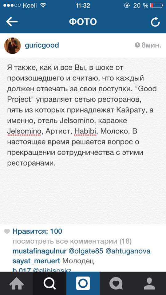 Жителей Астаны в социальных сетях призвали бойкотировать заведения, принадлежащие предпринимателю Кайрату Жамалиеву, который был арестован в связи с обвинением в вымогательстве и избиении Алиби Жумагулова, передает корреспондент Tengrinews.kz.