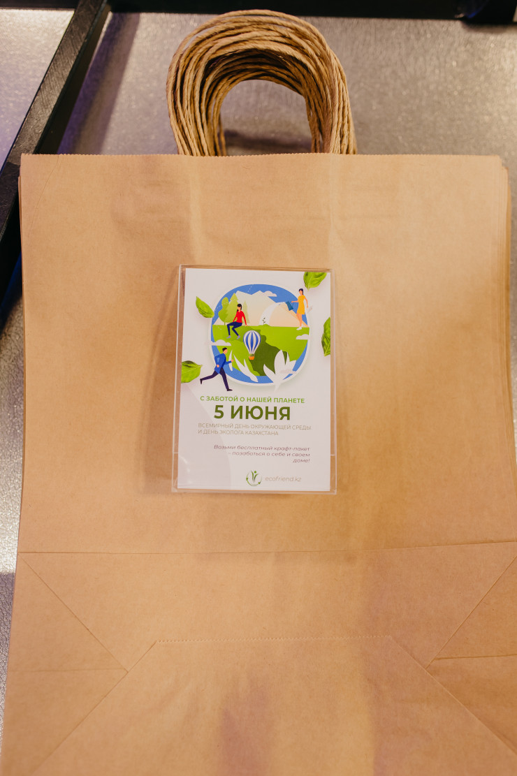 Компания EcoFriend провела акцию 5 июня в честь Всемирного дня охраны окружающей среды и Дня эколога Казахстана. Эко-пакеты казахстанского производства раздавали в торговых сетях "Меломан", Sulpak, Magnum, "Беккер и К".