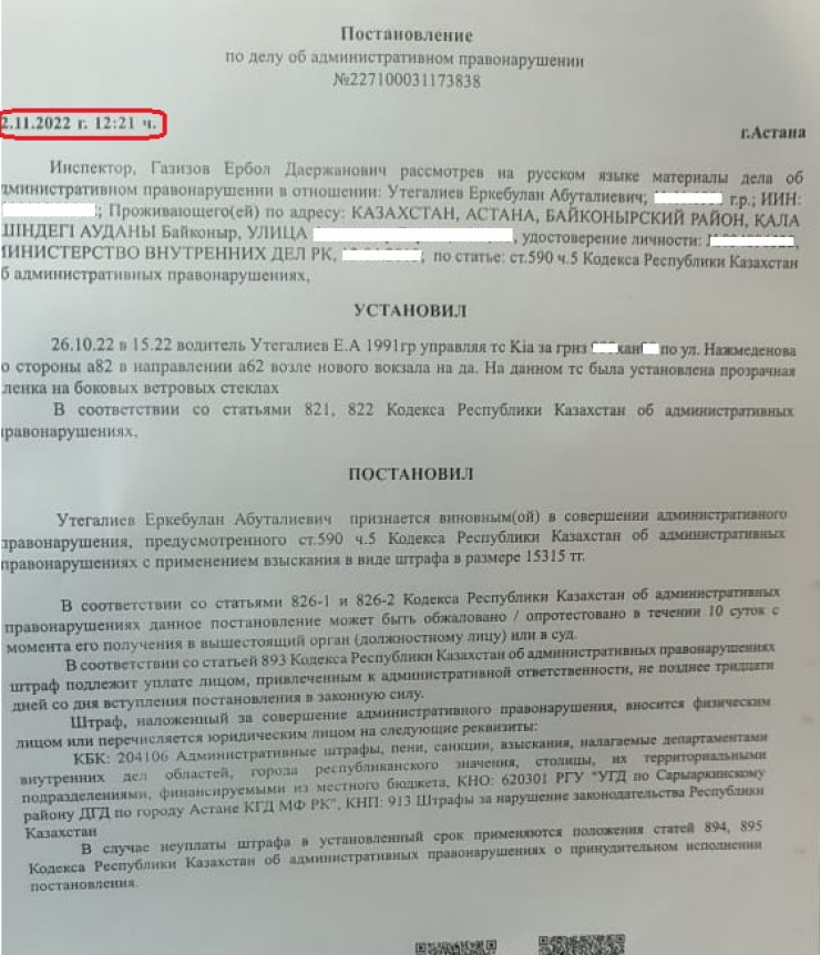 Однако в указанную дату мужчина не получил от полицейских бумагу. Утром следующего дня ему позвонил один из сотрудников полиции и сообщил, что завезет протокол. Получив вечером документ на руки, Утегалиев обнаружил, что протокол составлен 18 ноября, тогда как сам инцидент произошел 26 октября. Также правоохранители допустили ошибку в госномере авто, написав "ХАН" вместо "ХАМ".