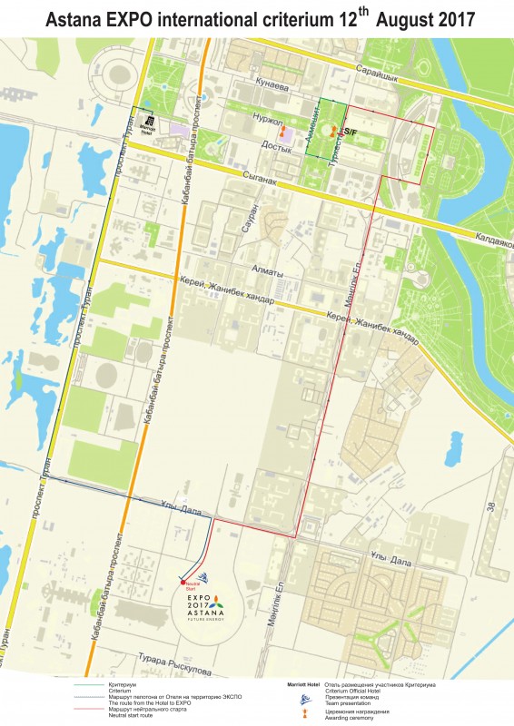 По данным медиа-центра "Астана Экспо 2017", презентация участников критериума начнется в 12:00 на сцене Амфитеатра ЭКСПО-2017, там же в 13:00 состоится торжественный (Нейтральный) старт соревнования. Далее, пелотон велогонщиков проследует к месту критериума в квадрате улиц монумента Байтерек, где пройдет гонка и церемония награждения победителей и призеров.