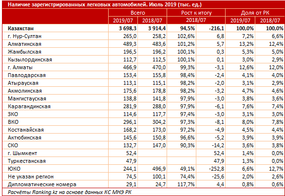 Годовой рост количества легковых автомобилей у населения был зафиксирован только в четырех регионах: в Нур-Султане до 265 тысяч (на 2,6 процента), в Алматинской области до 489,3 тысячи (на 1,2 процента),  в Жамбылской области до 196,5 тысячи (на 0,1 процента) и в Кызылординской области до 112,7 тысячи (на 0,1 процента). Выросло и количество автомобилей с дипломатическими номерами - на 17,7 процента, до 29,1 тысячи машин.