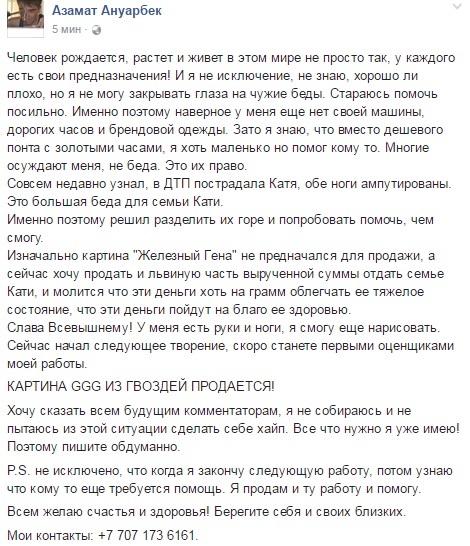 Автор "Железного Гены" продает картину для помощи алматинке, лишившейся ног Фото facebook.com/Азамат Ануарбек.