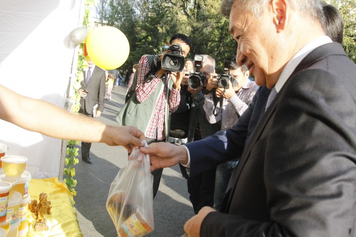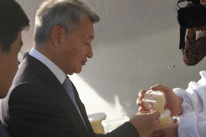 По ярмарке прошлись акимы Даниал Ахметов и Бауыржан Байбек, которые попробовали несколько сортов меда. Пчеловоды подарили главе города около пяти килограммов меда.
