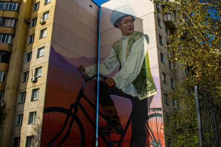 Как и многие его муралы, работа в Алматы посвящена мотивам людей и природе. Каждая его работа рассказывает свою определенную историю. На расписанном фасаде южной столицы Казахстана изображен молодой мужчина в национальном костюме на велосипеде на фоне гор.