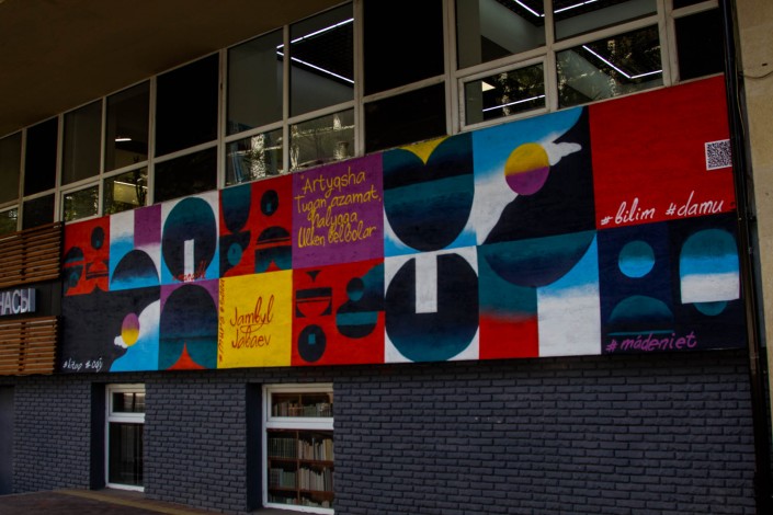 Яркими красками разрисовали библиотеку имени Жамбыла. На стене библиотеки появилась фраза акына. Стену также украшают хэштеги на латинице. Воплотить эту идею в жизнь помогли молодые художники из Алматы.