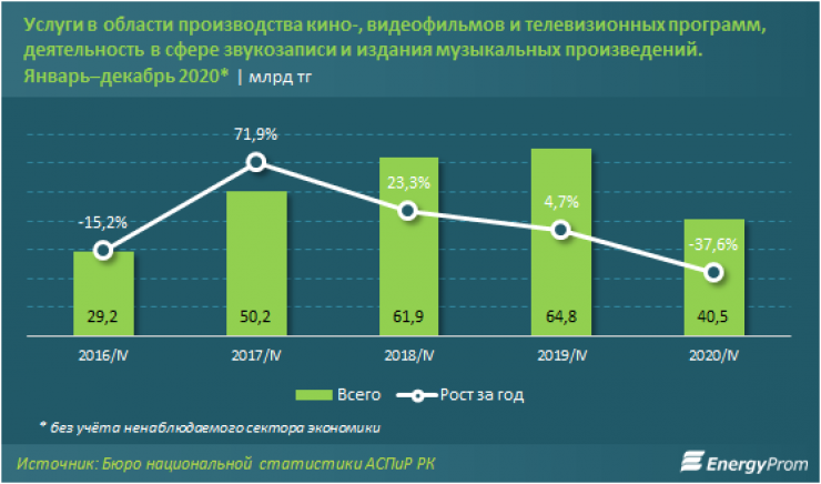 За январь – декабрь 2020 года в области кино- и видеопроизводства и звукозаписи оказали услуг на 41 миллиард тенге - на 37,4 процента меньше, чем годом ранее.