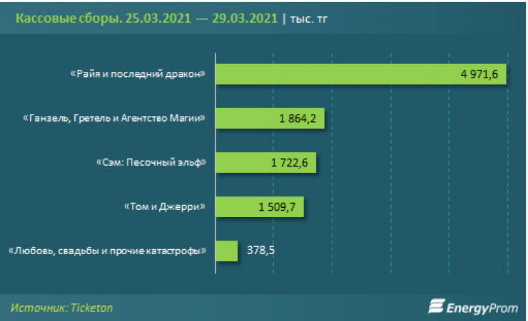 В последний мартовский уикенд (25–29 марта), по данным Ticketon.kz, лидером кинопроката по кассовым сборам в стране стал американский полнометражный приключенческий анимационный фильм "Райя и последний дракон". Шла четвертая неделя в прокате, и кинотеатры заработали на нем 5 миллионов тенге.
