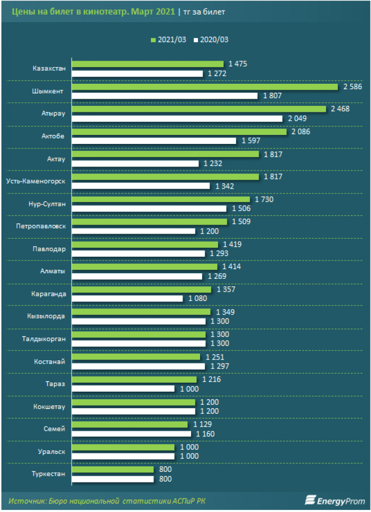 В марте стоимость билетов в кино достигла в среднем 1,5 тысячи тенге - сразу на 16 процентов больше, чем ровно год назад, в 2020-м. Несмотря на это, из-за карантина и локдаунов индустрия находится в очень шатком положении, передает Tengrinews.kz со ссылкой на Energyprom.kz.