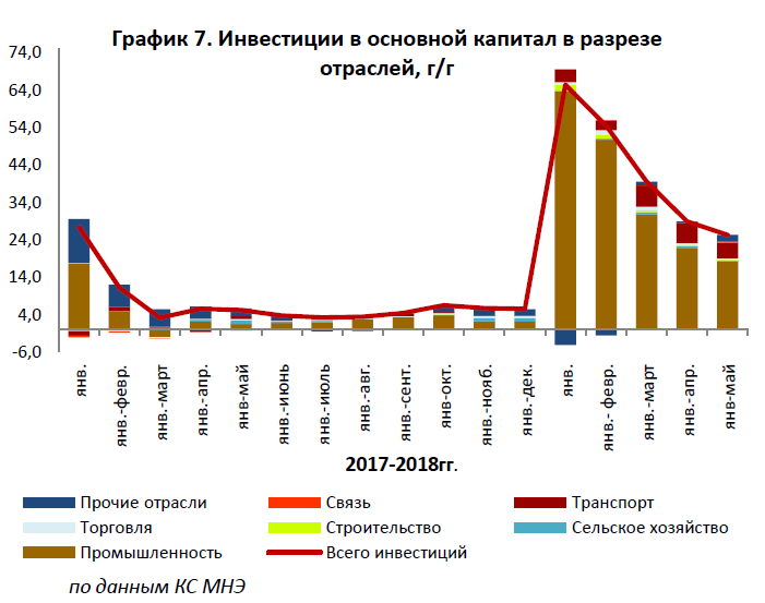 "За январь-май 2018 года инвестиции в основной капитал увеличились на 25,3 процента. В отраслевой разбивке инвестиции в основной капитал демонстрируют позитивную динамику по всем основным отраслям. При этом наибольший рост инвестиционных вложений отмечается в промышленность - рост на 31,2 процента, операции с недвижимым имуществом на 41,4 процента, транспорт на 36,1 процента и строительство на 37,6 процента", - говорится в сообщении.
