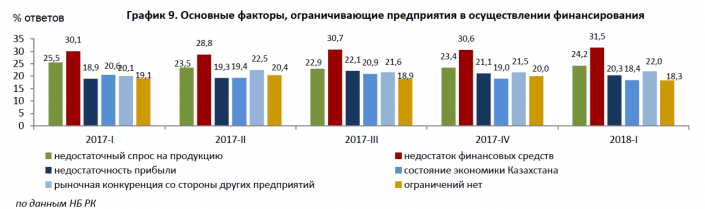 В Нацбанке пояснили, что основным источником финансирования остаются собственные средства предприятий. По результатам опроса предприятий реального сектора экономики, проведенного финансовым регулятором в первом квартале 2018 года, установлено, что среди основных факторов, ограничивающих осуществление финансирования оборотных и/или основных средств, респонденты отметили недостаток финансовых средств, недостаточный уровень спроса на продукцию, рыночную конкуренцию со стороны других предприятий, недостаточность прибыли и состояние экономики Казахстана.