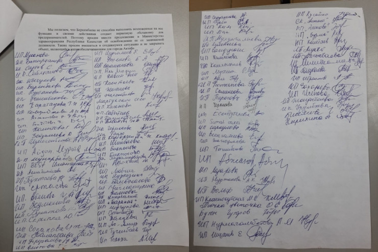 В конце письма предприниматели просят вмешаться в ситуацию и не закрывать объект, "являющийся жизнеобеспечивающим для города Актобе". "Полагаем, что Беркимбаева не способна выполнять возложенные на нее функции и своими действиями создает нервозную обстановку для предпринимателей", - говорится в открытом письме.