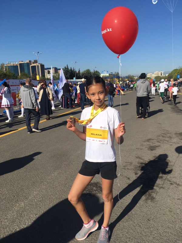 11-летняя Милана Бегалиева пробежала детскую дистанцию за 14 минут 30 секунд. Участвует уже второй год. "В начале волновалась, но меня поддержал брат, он бежал со мной за компанию, ободрял. Сейчас испытываю большую радость", - говорит она.