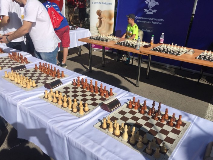 09.38. Участники "Алматы Марафона" могут не только ноги размять, но и в шахматы поиграть. Столики стоят на месте старта и финиша.