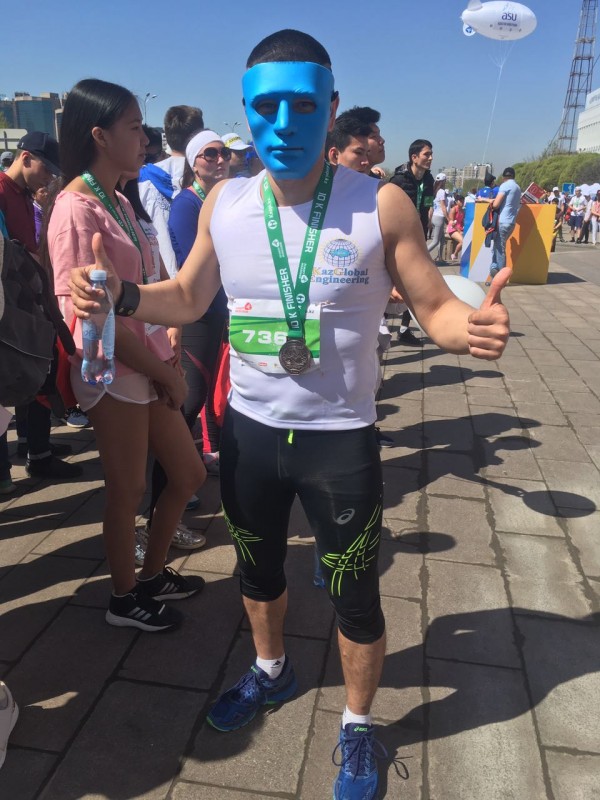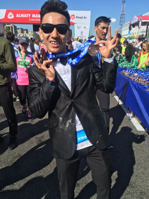 09.48 Для участия в "Алматы Марафоне" не обязательно покупать дорогое снаряжение. Это доказал Кунтуаров Диас. Он пробежал 21 километр в костюме. Его время - 1 час 30 минут.