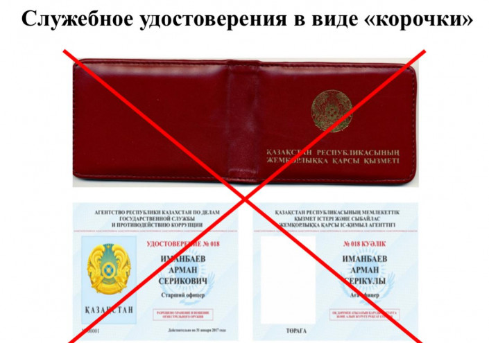 "Продвигая новую модель противодействия коррупции на основе идеологии добропорядочности, очень важно избавиться от атрибутов и символов прошлого. Не секрет, что служебные удостоверения в виде "корочек" имеют негативное восприятие в обществе и справедливо ассоциируются со злоупотреблениями и вседозволенностью. Во-вторых, это гораздо экономичнее и функциональнее. Стоимость изготовления новых удостоверений в два с половиной раза раза дешевле старых", - пояснил руководитель департамента кадровой работы Нурлан Жаксимбетов на пресс-конференции, добавив, что много людей занимались вымогательством и запугиванием, представившись сотрудниками Агентства по противодействию коррупции.