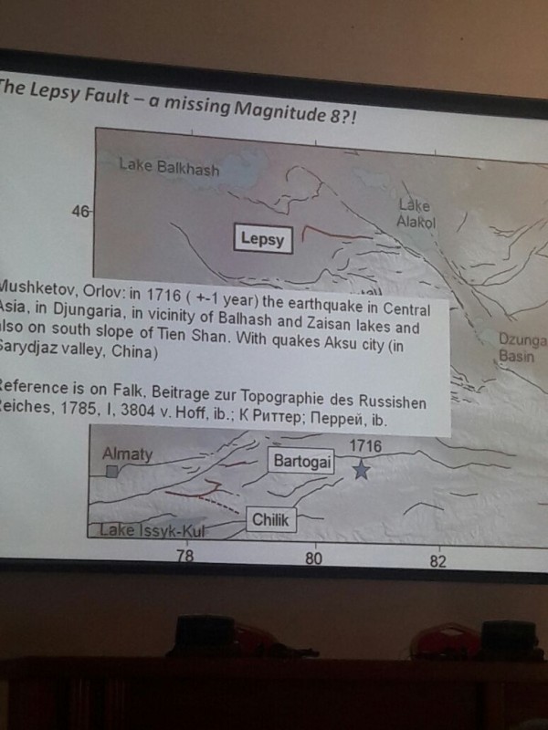 Он продемонстрировал собравшимся так называемый "Лепсинский разлом" недалеко от поселка Лепсы и гор Джунгарского Алатау. Сдвиг тектонических плит, по данным ученых, в этом случае составляет около десяти метров. "Когда произошло землетрясение, изменился канал реки Лепсы. Исследовав отложения в старом русле, нам удалось выяснить, что землетрясение произошло около 400 лет назад. Удивительно, но мы не видим никаких исторических записей о событии. Потенциально речь может идти о землетрясении 1716 года. В оригинальной исторической записи описаны разрушения в районе озер Балхаш и Зайсан, а также в городе Аксу в Китае. Но я не думаю, что это что-то, что мы можем сказать с абсолютной уверенностью", - пояснил ученый.