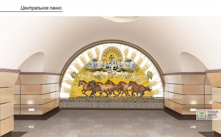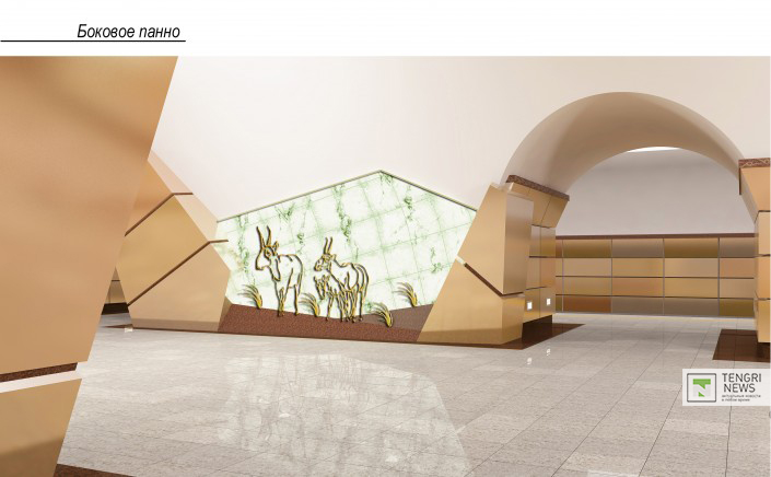 "Общий спокойный облик станции нарушают стильно вписанные четыре боковых панно. На них изображены символы степей, без которых просто невозможно представить себе Сарыарку. Это такие представители фауны, как сайгаки,  дрофа, косуля и так далее. Также на одном из панно изображен резвящийся конь на фоне стоянки кочевого народа, символом которого является юрта, показывая неразрывную связь кочевников с природой", - говорится в описании. Фон панно выполнен из оникса с подсветкой. Фигуры животных и предметы выполнены из латуни.