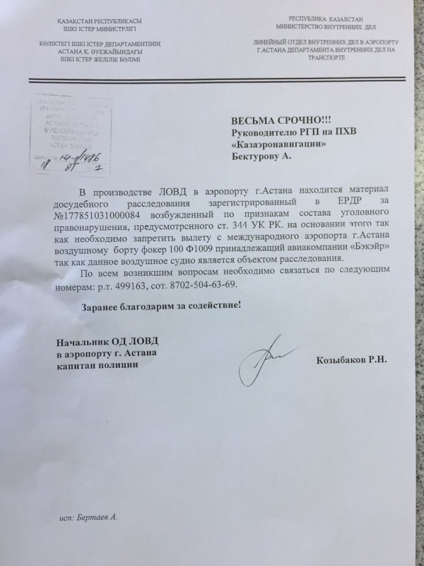 Самолет "Бек Эйр" в аэропорту Астаны задержан сотрудниками правоохранительных органов и транспортной прокуратуры. Об этом корреспонденту Tengrinews.kz сообщил председатель правления авиакомпании "Бек Эйр" Нурлан Жумасултанов. По его данным, воздушное судно задержано по причине расследования уголовного дела по статье "Нарушение правил безопасности движения или эксплуатации железнодорожного, воздушного, морского или речного транспорта".