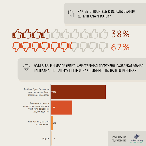 Что касается отношения родителей к использованию детьми смартфонов, то больше половины респондентов относятся к этому негативно. Кроме того, 70 процентов опрошенных считают, что если во дворе будет построена качественная спортивно-развлекательная площадка, то это положительным образом повлияет на детей, они будут больше бывать на воздухе.
