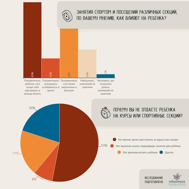 Агентство также выяснило, почему родители не отдают детей на курсы или в спортивные секции. Более чем половине респондентов попросту для этих целей не хватает денег, 19 процентов опрошенных ответили, что у них нет времени возить ребенка на секции.