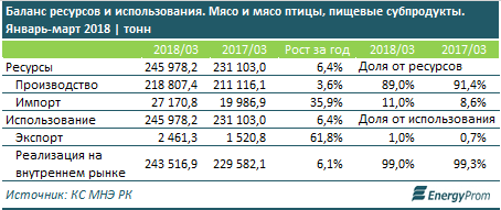 Потребление мяса растет - объемы реализации мяса и мясных субпродуктов на внутреннем рынке выросли на 6,1 процента за год. Экспорт также в плюсе - сразу на 61,8 процента.