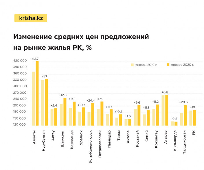 Что касается годового периода, прирост индекса (относительно января 2019 года) составил 10 процентов. Города с наибольшей динамикой - Усть-Каменогорск (+24,4 процента), Талдыкорган (+20,6 процента), Петропавловск (+17,9 процента), Караганда (+14,1 процента), Шымкент (+12,8 процента) и Алматы (+12,7 процента). В Нур-Султане значительных изменений не произошло (+1,7 процента). Снижение отмечается только в Кызылорде (-0,8 процента).