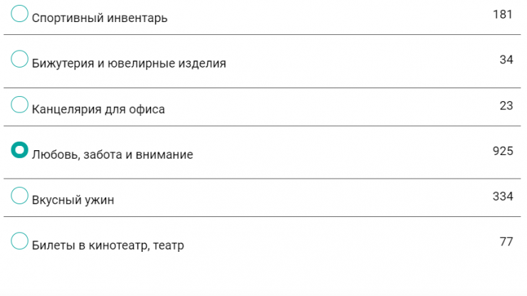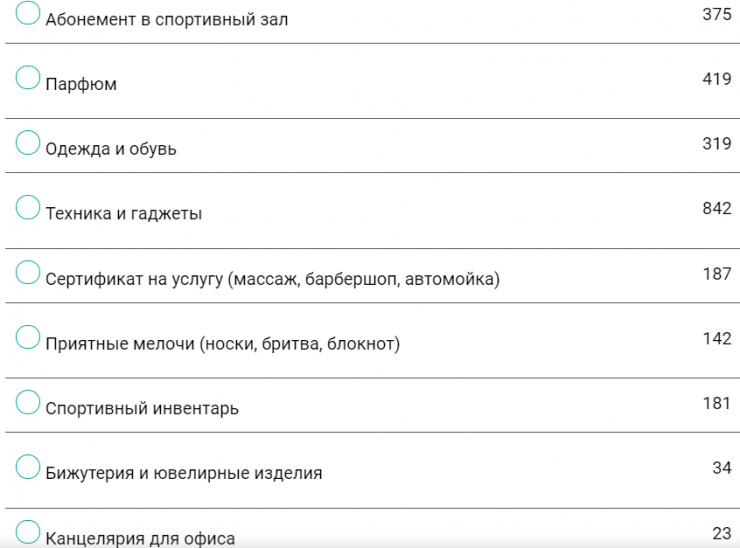 А вот меньше всего мужчины хотят получить билеты в кинотеатр или театр, бижутерию и ювелирные изделия, и канцелярию для офиса.