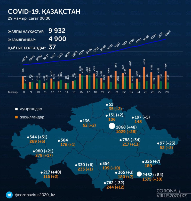 Всего за сутки в Казахстане коронавирусом заразились 356 человек. Общее число заразившихся с начала эпидемии в стране выросло до 9932.
