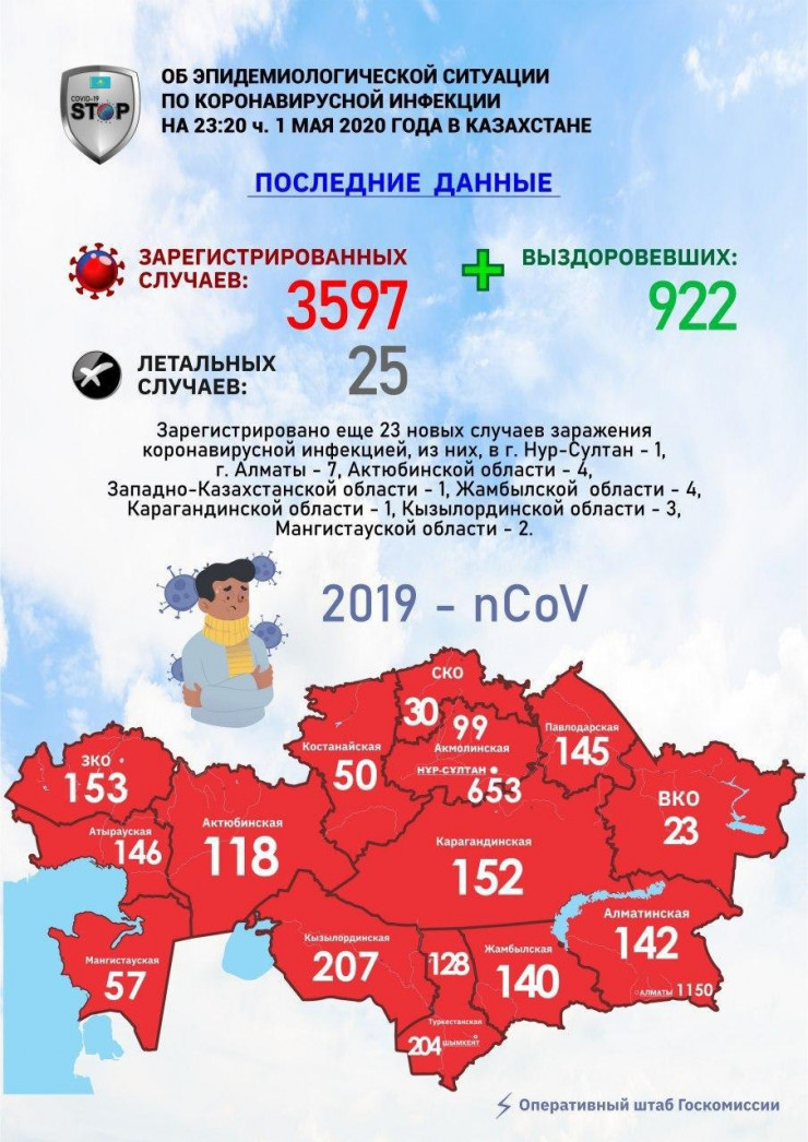 По состоянию на 23.20 часов 1 мая в Казахстане зарегистрировано еще 23 новых случая заражения коронавирусной инфекцией, передает Оперативный штаб Госкомиссии.