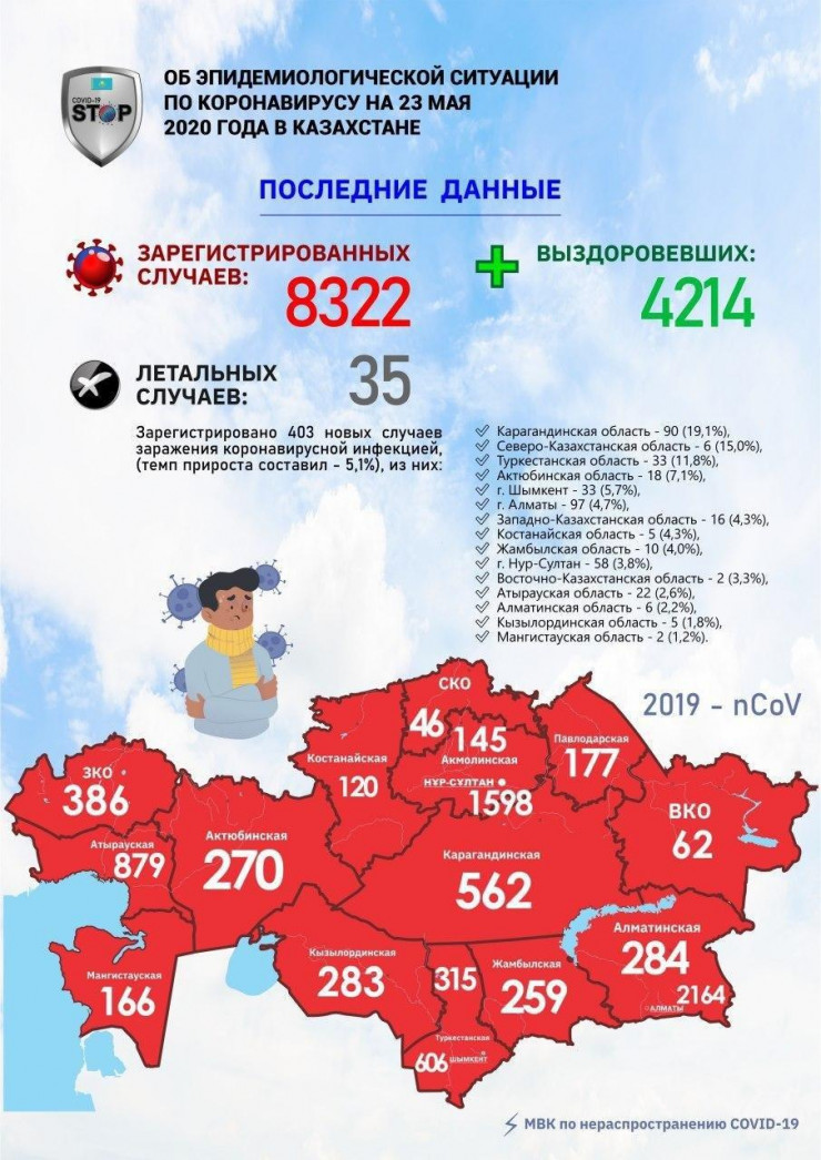 Количество случаев заражения коронавирусной инфекцией в Казахстане составило 8322, передает Tengrinews.kz со ссылкой на Межведомственную комиссию по нераспространению COVID-19.