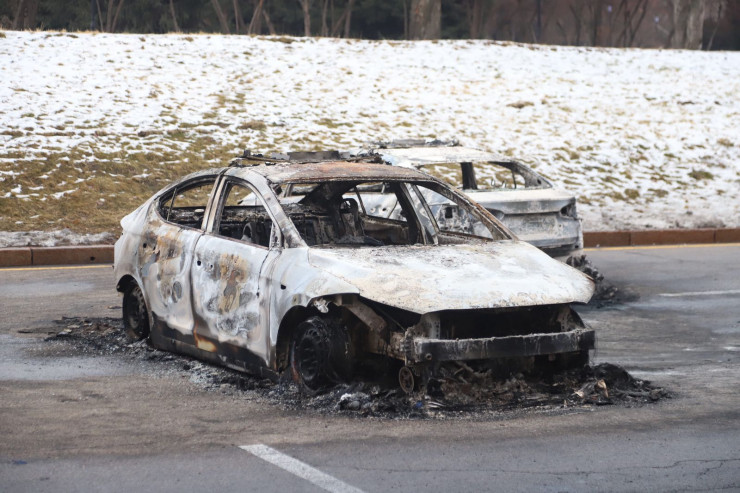 Недалеко от акимата находятся останки сгоревших автомобилей.