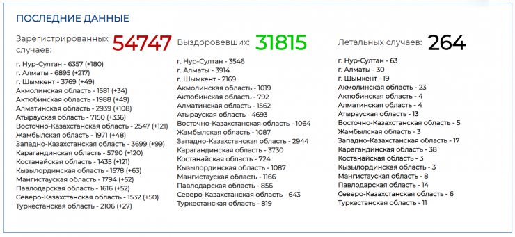 По данным Межведомственной комиссии по нераспространению коронавируса, число выздоровевших в стране достигло 31 815 человек. Сообщается, что за сутки в стране выписали из стационаров 538 человек. Больше всего в Атырауской (112), Актюбинской (92) и Карагандинской областях (81).