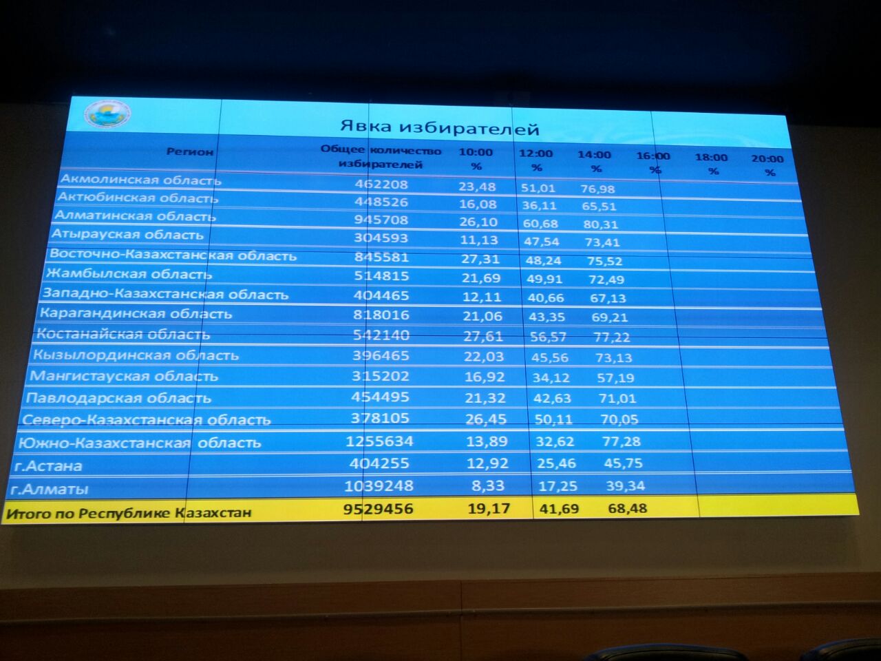 Согласно данным, представленным избирательными участками, по состоянию на 14 часов по времени Астаны проголосовали 68,48 процента от общего количества избирателей.