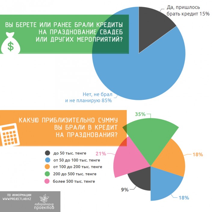 Отмечается также, что 85 процентов респондентов никогда не брали и не планируют брать кредиты на празднование свадеб или других мероприятий, 15 процентам приходилось их брать. При этом, 35 процентов опрошенных брали кредиты на сумму от 200 до 500 тысяч тенге, 21 процент - более 500 тысяч. 18 процентов респондентов брали кредиты на сумму от 100 до 200 тысяч тенге. И столько же опрошенных - от 50 до 100 тысяч тенге.